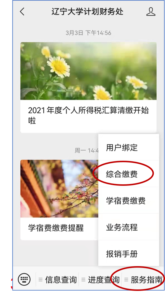 1.登录微信,微信中搜索并关注“辽宁大学计划财务处”微信公众号。进入公众号通过右下方“服务指南”,选择“综合缴费”进入“缴费平台”进入登录界面。