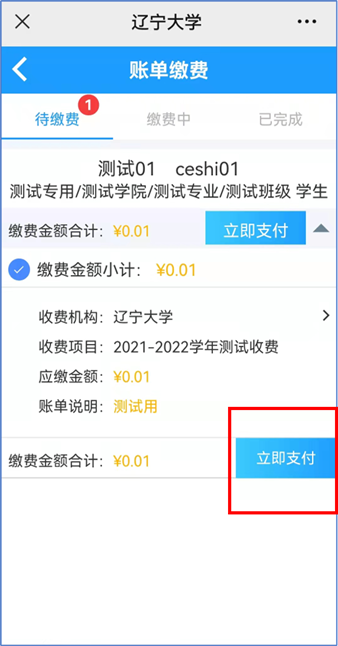 4.选择需要缴费的账单,核对缴费信息,如有问题请联系继续教育管理处;缴费信息确认无误,点击“立即支付”。